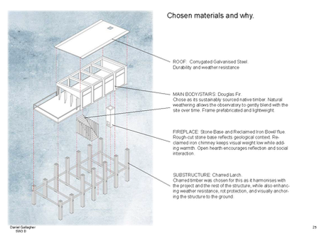 The Reforesting Pavilion sits gently within the ruins of a former Highland farmstead, overlooking a landscape shaped by centuries of change. Raised on slender timber stilts, the structure floats above the old stone walls, allowing history and new growth to coexist. Made from Douglas Fir, charred larch, and stone, it weathers naturally into its surroundings, blending with the rugged terrain. Inside, the pavilion offers a quiet place to pause and observe the return of native woodland a space that invites reflection, care, and connection to the land. More than a shelter, it becomes part of the rewilding process itself, a marker of renewal in a place once defined by loss.